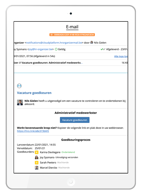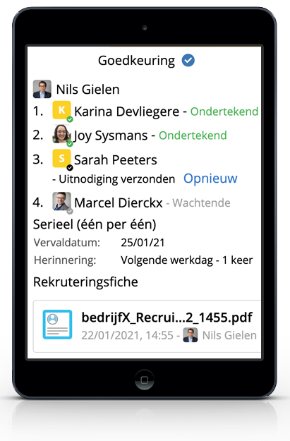 Per vacature kan er een goedkeuringsproces opgezet worden. Elke user kan ingeschakeld worden om een vacature goed te keuren of feedback te geven. De goedkeurders krijgen een overzicht van het gehele proces en kunnen goedkeuren of weigeren. Een gedetailleerde opvolging zodat u geen vertraging oploopt.