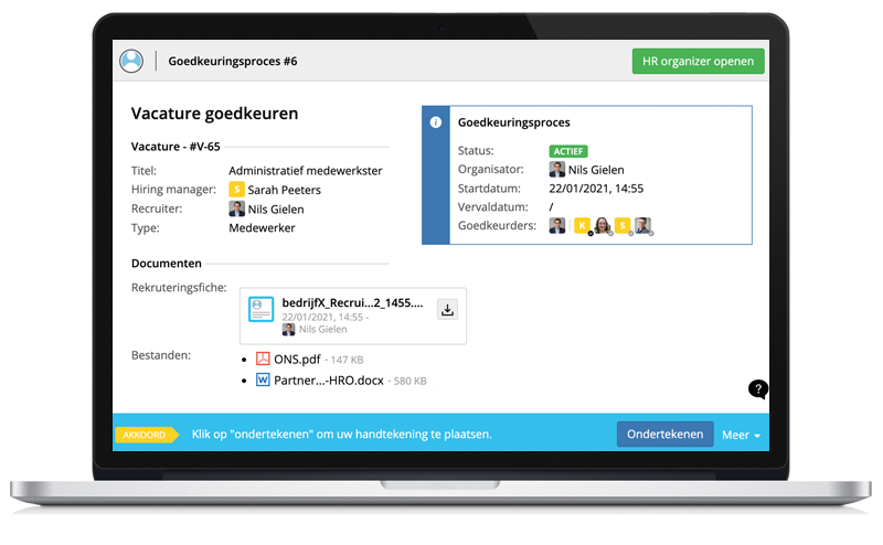 Via HR organizer weet u 100% zeker welke info van de rekruteringsfiche of van de bijgevoegde bestanden werd goedgekeurd.