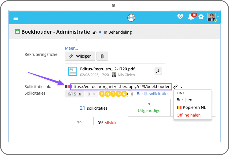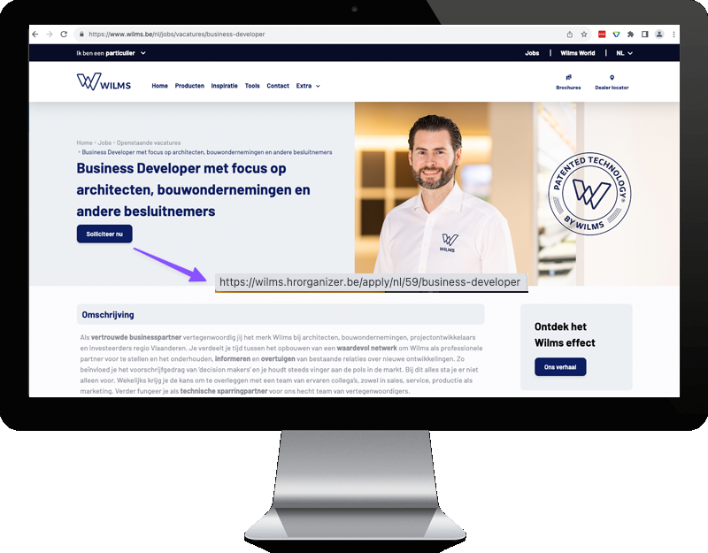 HR organizer kan gekoppeld worden met uw eigen website via een sollicitatie URL